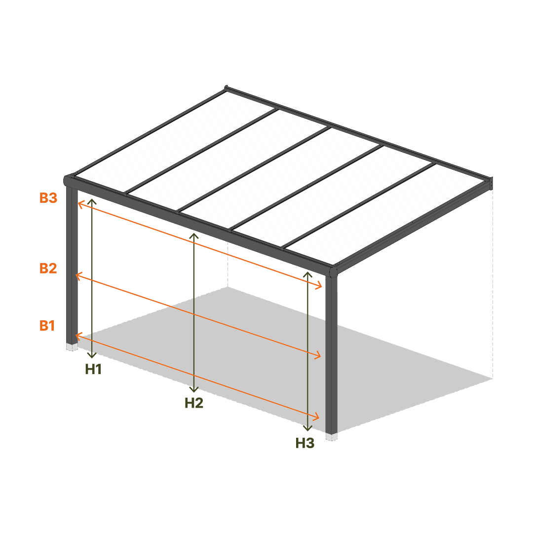 Meet de op drie plekken de breedte. Meet de breedte op aan de onderkant van de overkapping (B1), in het midden (B2) en aan de bovenkant (B3). Noteer de breedste gemeten maat. Dit wordt het uitgangspunt voor de breedte.