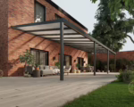 Deze ForaVida® terrasoverkapping met polycarbonaat dak in de kleur antraciet van 12,03 meter breed en 4,0 meter diep is uitgevoerd op 4 staanders. De staanders zijn standaard 2,5 meter lang.